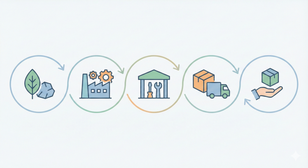 Cette approche systémique permet d’identifier l’impact global du produit sur l’ensemble de son cycle de vie et de comprendre que la majorité des impacts RSE se situent souvent en dehors de l’entreprise elle-même (ex. extraction minière, transport international, usage du produit).