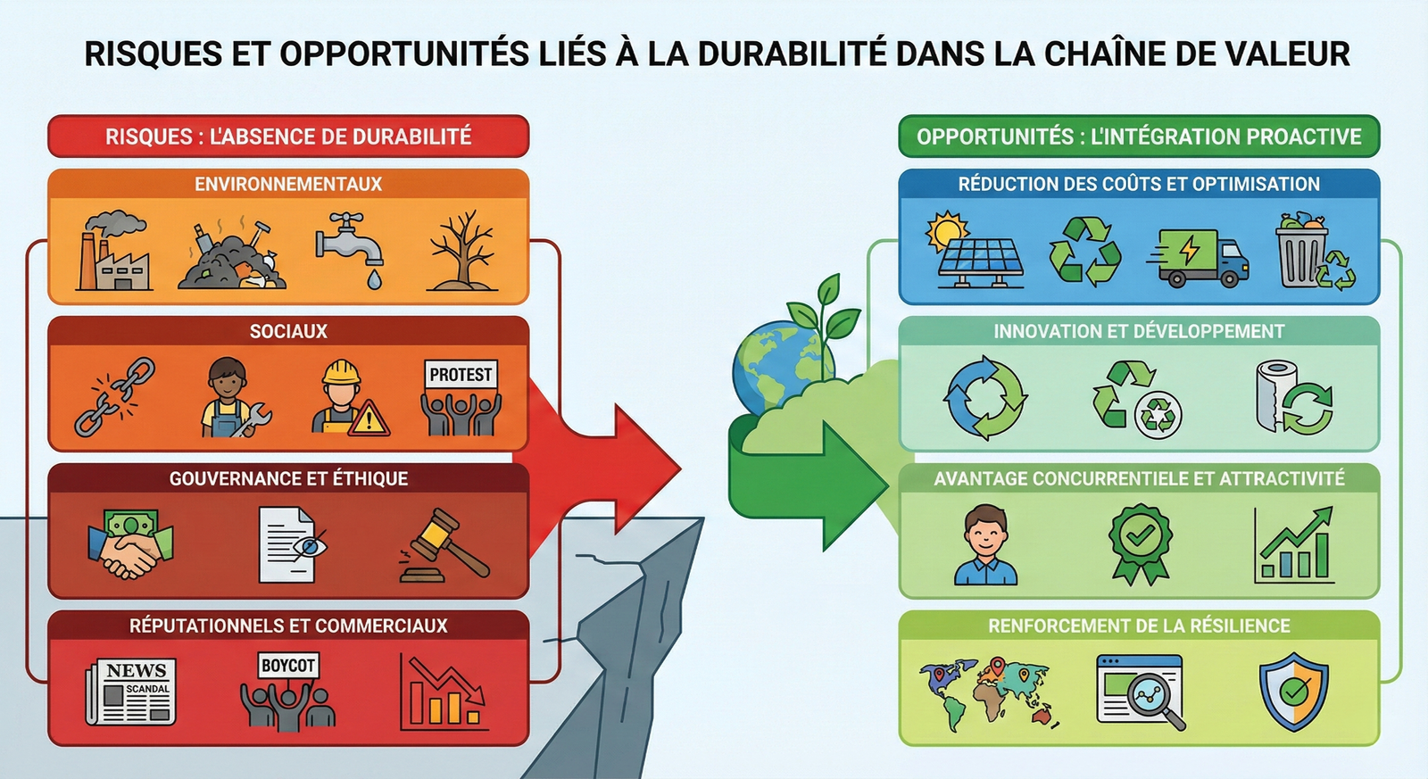 La transition vers une chaîne de valeur durable représente à la fois un défi et un levier stratégique. Elle expose l’entreprise à des risques si elle est ignorée, mais ouvre aussi des opportunités majeures lorsqu’elle est intégrée de manière proactive.
