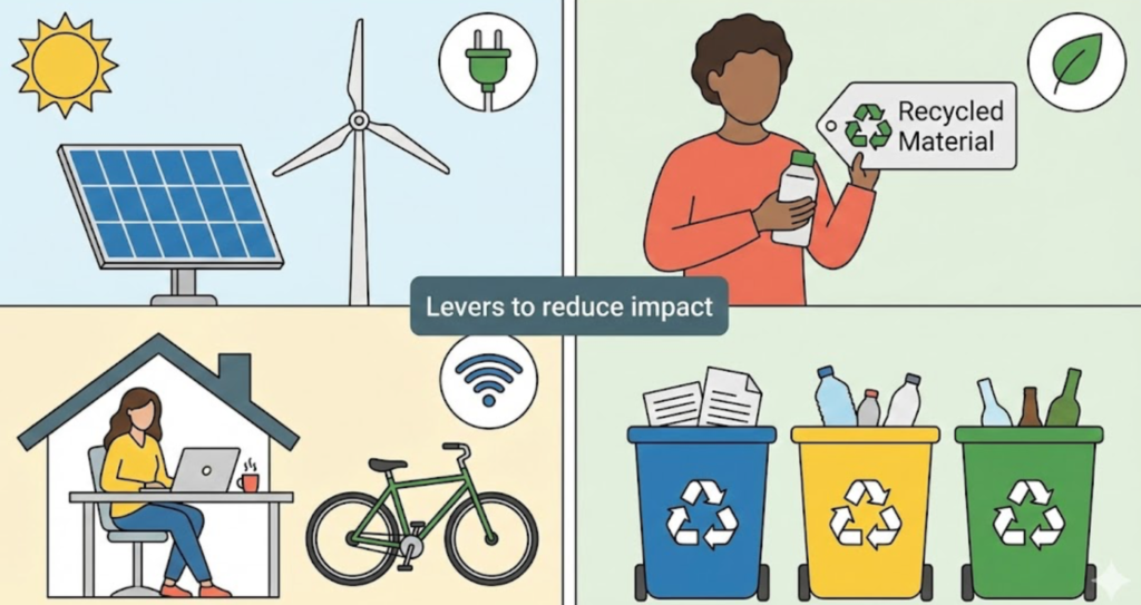 Une fois les résultats obtenus, plusieurs leviers peuvent être activés. Le premier concerne l’énergie : réduire les consommations, passer à des sources renouvelables ou optimiser les équipements. Le second renvoie aux achats, qui représentent souvent la majorité des émissions : choisir des fournisseurs plus vertueux, privilégier des matériaux recyclés ou renforcer la durabilité des produits. Enfin, des actions liées à la mobilité (télétravail, mobilité douce, flotte électrique) et à la gestion des déchets complètent l’approche. L’essentiel est d’engager une démarche progressive mais continue, en fixant des objectifs clairs et atteignables.