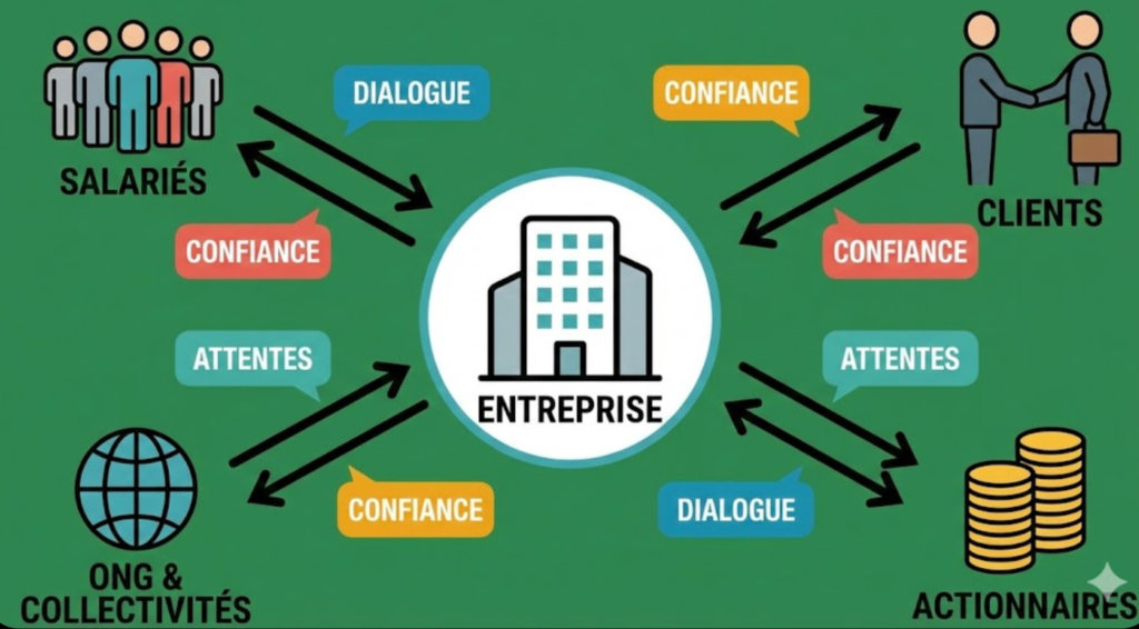Le dialogue avec les parties prenantes est un élément essentiel de la gouvernance moderne. Il vise à identifier et intégrer les attentes des acteurs internes et externes à l’entreprise : salariés, actionnaires, clients, fournisseurs, ONG, collectivités territoriales, etc.